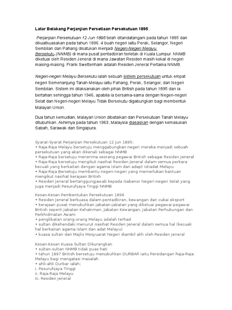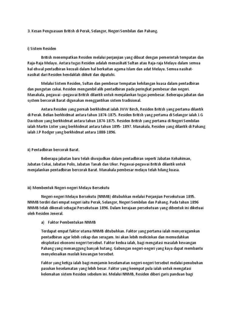 Sistem ini dilaksanakan oleh pihak british pada tahun 1895 dan ia bertahan sehingga tahun 1946. Pelaksanaan system residen mendatangkan pelbagai kesan ke atas negeri. Sejarah tingkatan 3 adam asmaca. Kenal pasti ayat tunggal dan ayat majmuk. Pentadbiran ini juga dikenali sebagai persekutuan 1896.