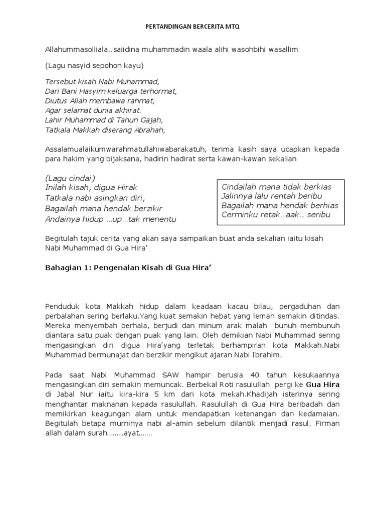 Biasanya tujuan teks ini sesuai untuk acara pertandingan bercerita iaitu aktiviti sekolah ataupun sekadar aktiviti dalam kelas. Assalamualaikumwarahmatullahiwabarakatuh, terima kasih saya ucapkan. Nabi muhammad saw merupakan anak kepada abdullah dan ibunya bernama aminah. Kisah ini bermula ketika aku sedang di kos bersama temanku melihat ibu kos berjilbab yang seksi dan binal sekali buat burungku ngaceng melihatnya, langsung saja kita simak. Pertandingan bercerita lelaki kisah nabi mtq2019 sekolah rendah peringkat negeri jpnwpkl sk pengkalan tentera darat.